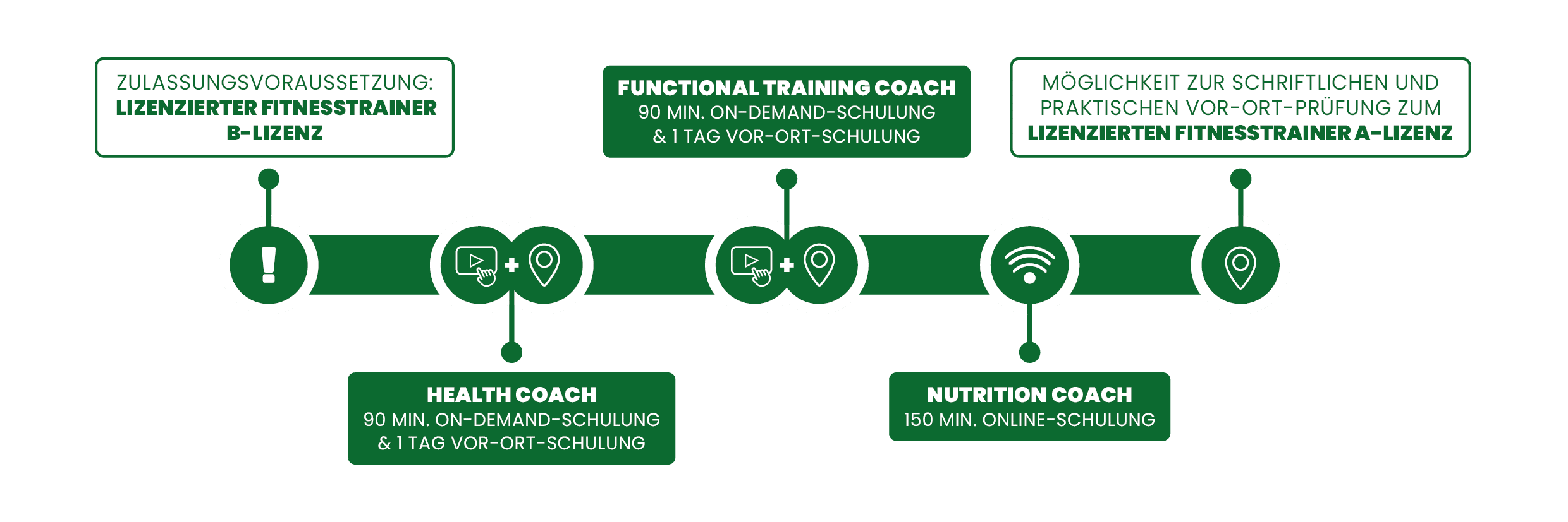 Als A-lizenzierte/-r Fitnesstrainer/-in werden Deine Qualifikationen im Gesundheits-, Fitness- und Leistungsorientierten Training geschärft. Du bist damit für Fitnessstudios, aber auch als Personal Trainer ganzheitlicher Begleiter Deiner Kunden für einen gesunden Lifestyle.